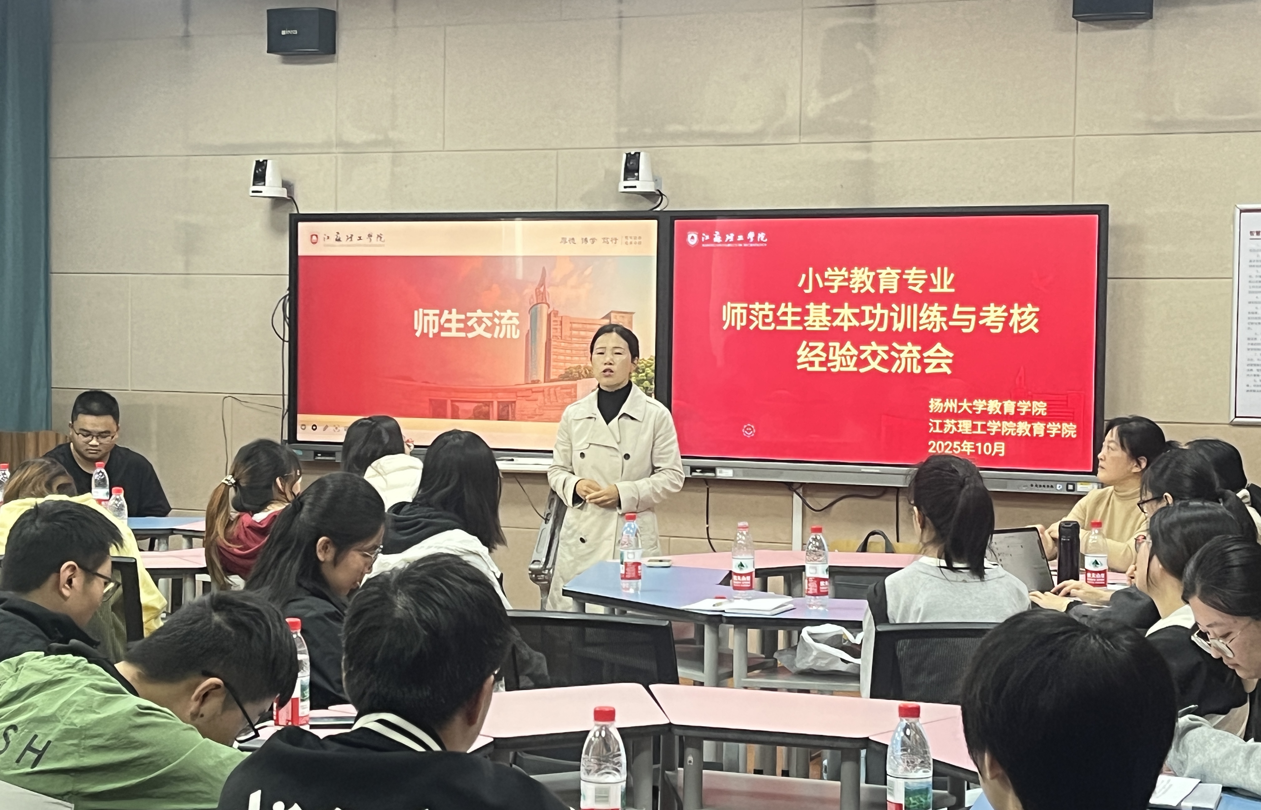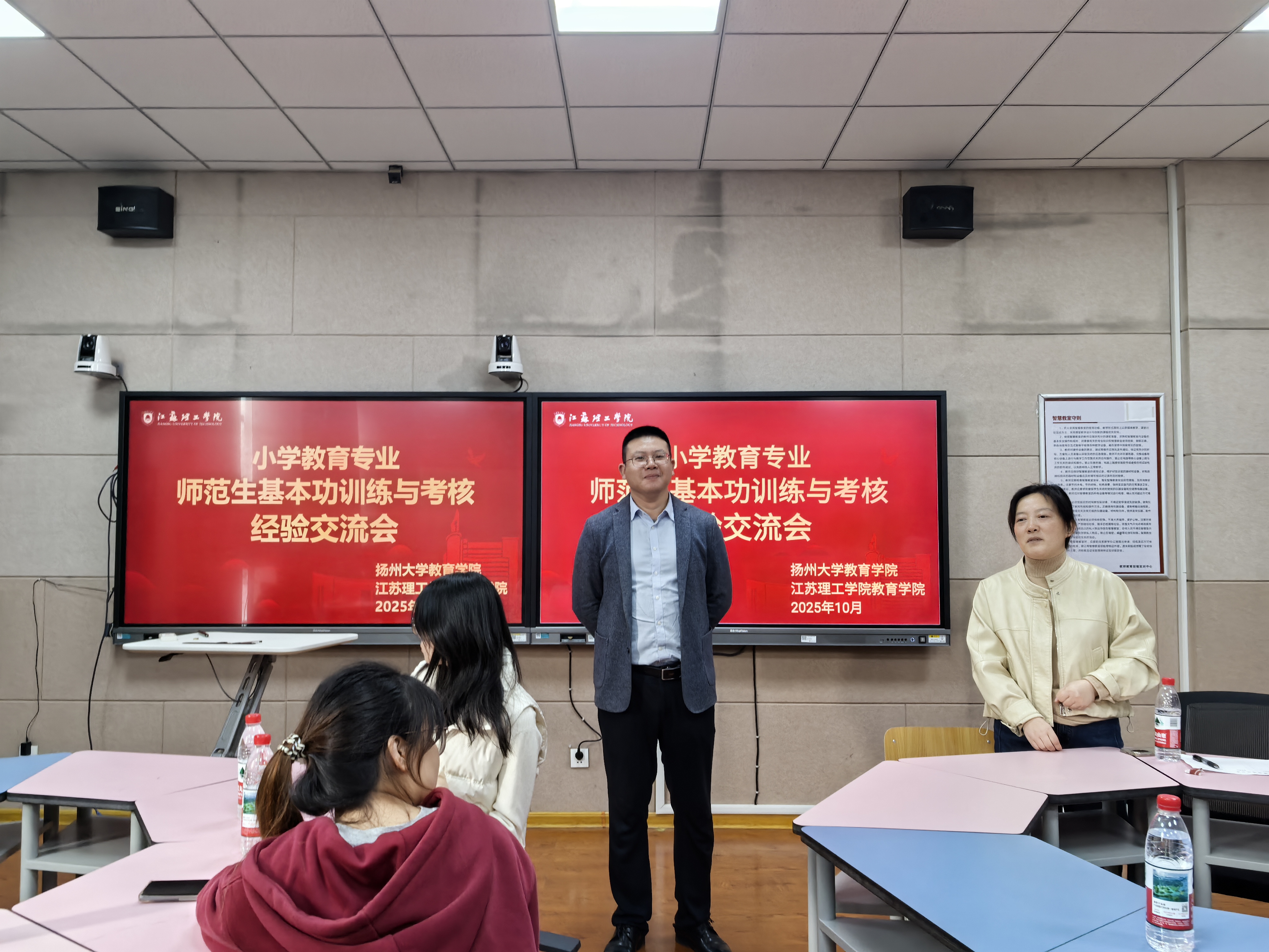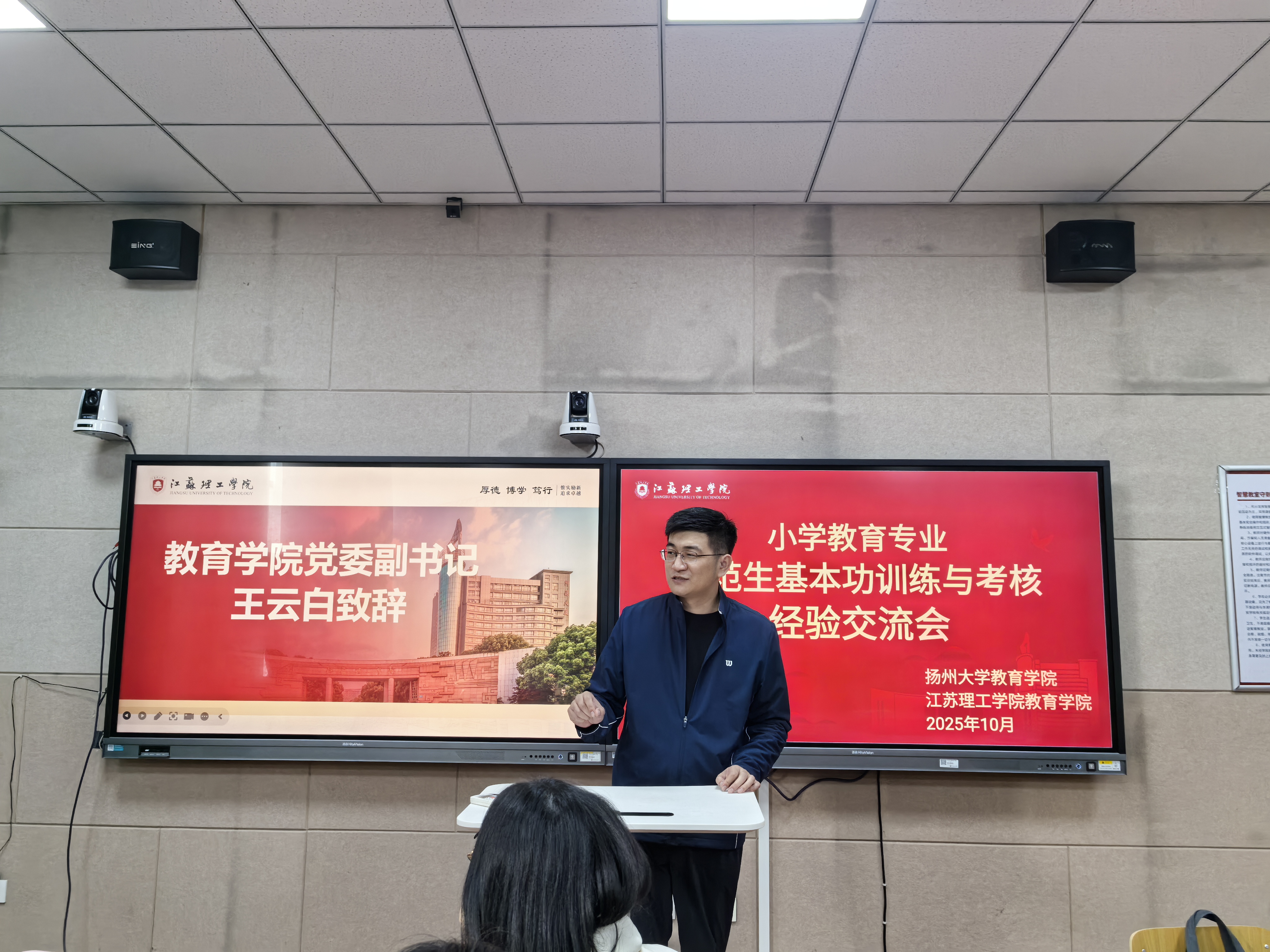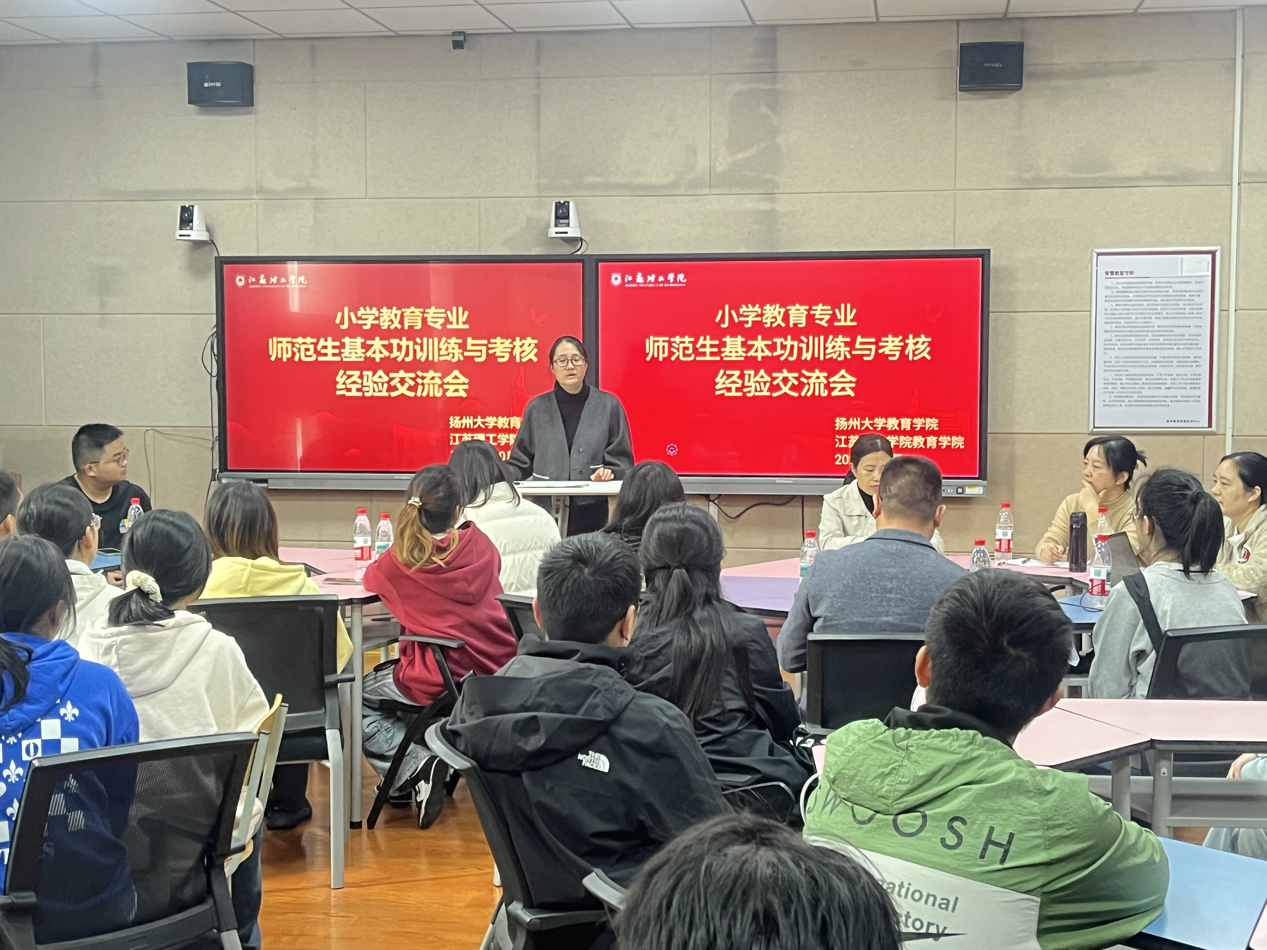10月31日上午,扬州大学教育学院初等教育系主任张华率小学教育专业师生一行来我院,开展“小学教育专业师范生基本功训练”专题交流活动。活动在41号楼智慧教室举行。此次活动旨在加强校际合作、深化师范生培养改革,通过经验互鉴与实践探讨,共同提升师范生教学技能与专业素养。我院党委副书记、副院长王云白,小学教育系主任孙杰、党支部书记吕莉敏,教师代表潘婉茹、张维及我院师范生代表参加了交流。活动由孙杰主持。