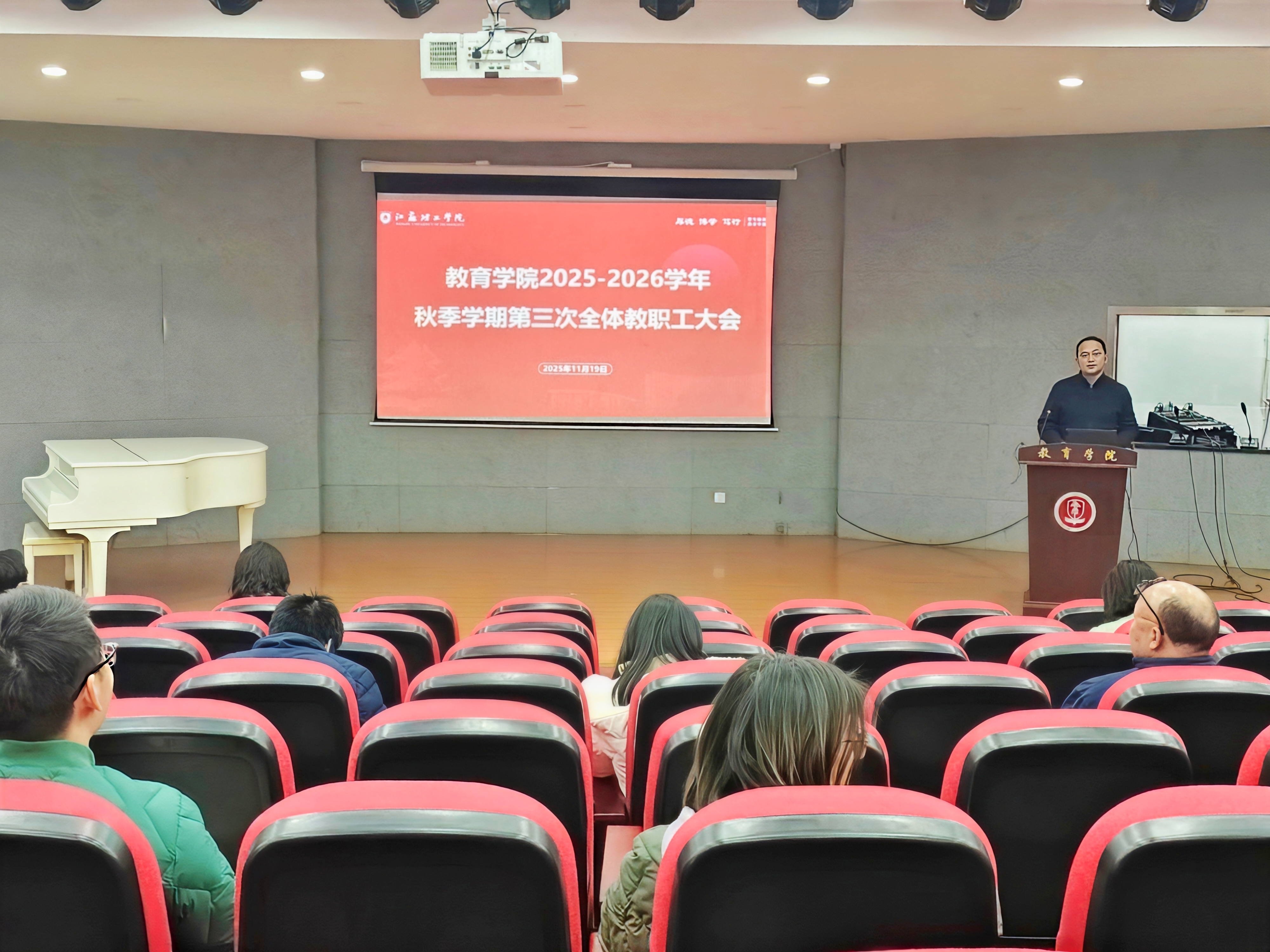为深入学习贯彻党的二十届四中全会精神,扎实推进教师队伍建设,全面赋能学院高质量发展,11月19日下午,我院在47号楼师范生音乐演播厅召开2025-2026学年秋季学期第三次全体教职工大会,学院党政领导班子与全体教职工参加会议。会议由党委书记杨新春主持。