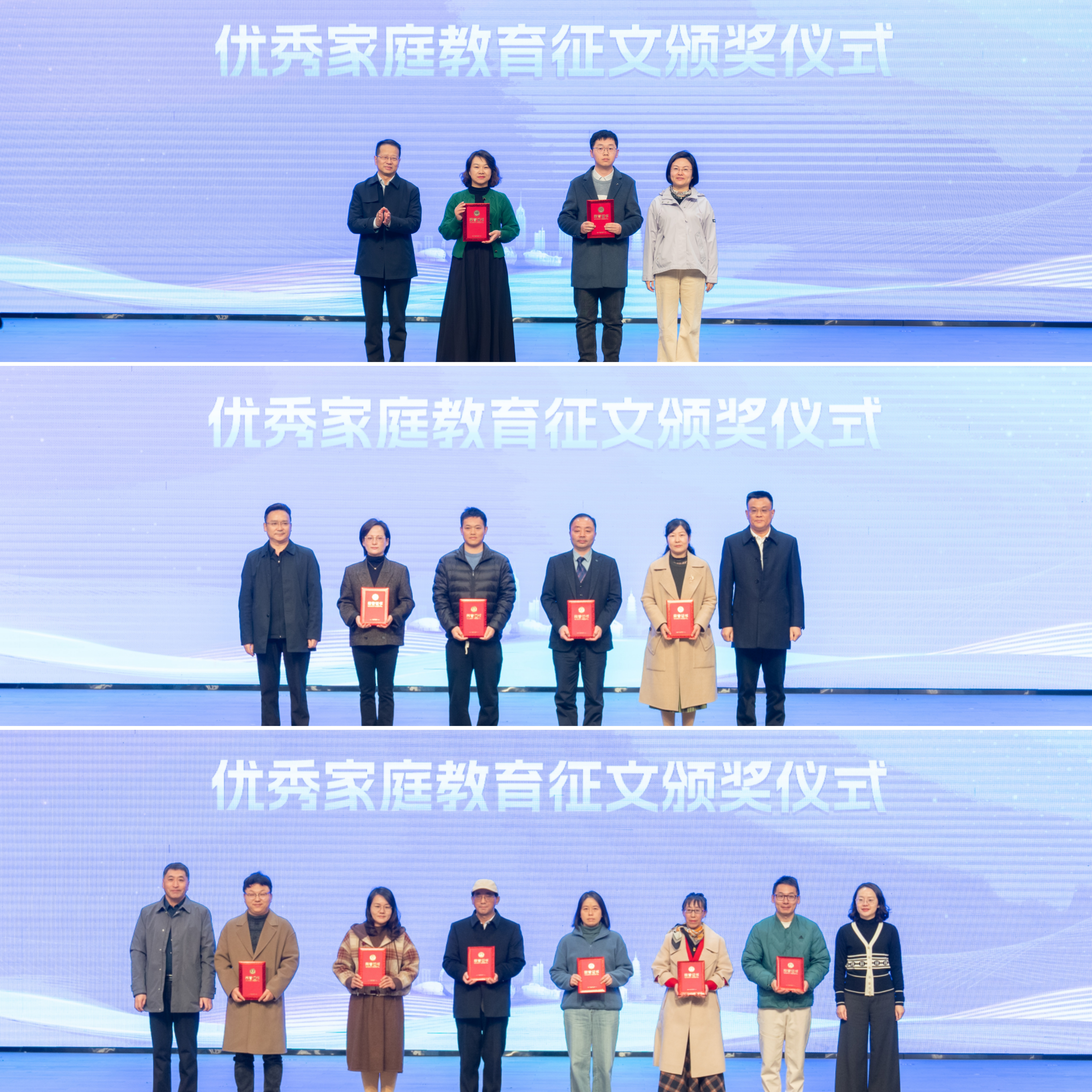 仪式现场对“智慧家长·幸福家庭”优秀家庭教育征文获奖者进行了颁奖。据悉此次征文共收到来自江苏、江西、四川、福建和山东等省份的投稿作品近百篇,经专家初评和复评等程序,共评选出获奖征文18篇,其中特等奖3篇,一等奖6篇,二等奖9篇。获奖作品主题丰富,涵盖亲子沟通、家校协同、家庭教育创新等主题,展现了常州家庭教育工作的活力与深度。