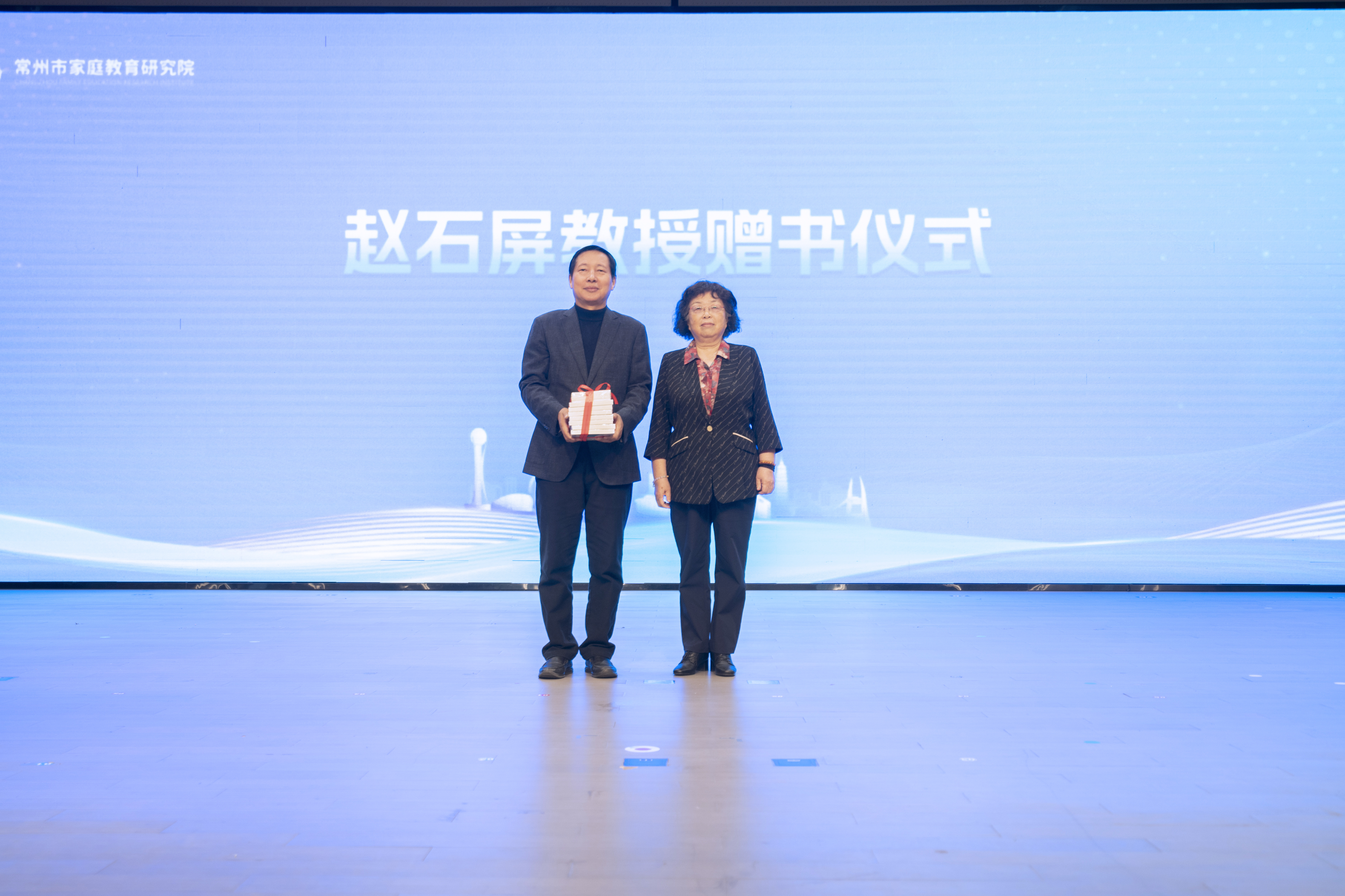 赵石屏教授向龙城家庭教育书院赠送个人著作,常州市家庭教育研究院执行院长李德方接受捐赠。赠书象征着学术支持与专业引领,为常州后续家庭教育研究与实践提供精神与知识力量。