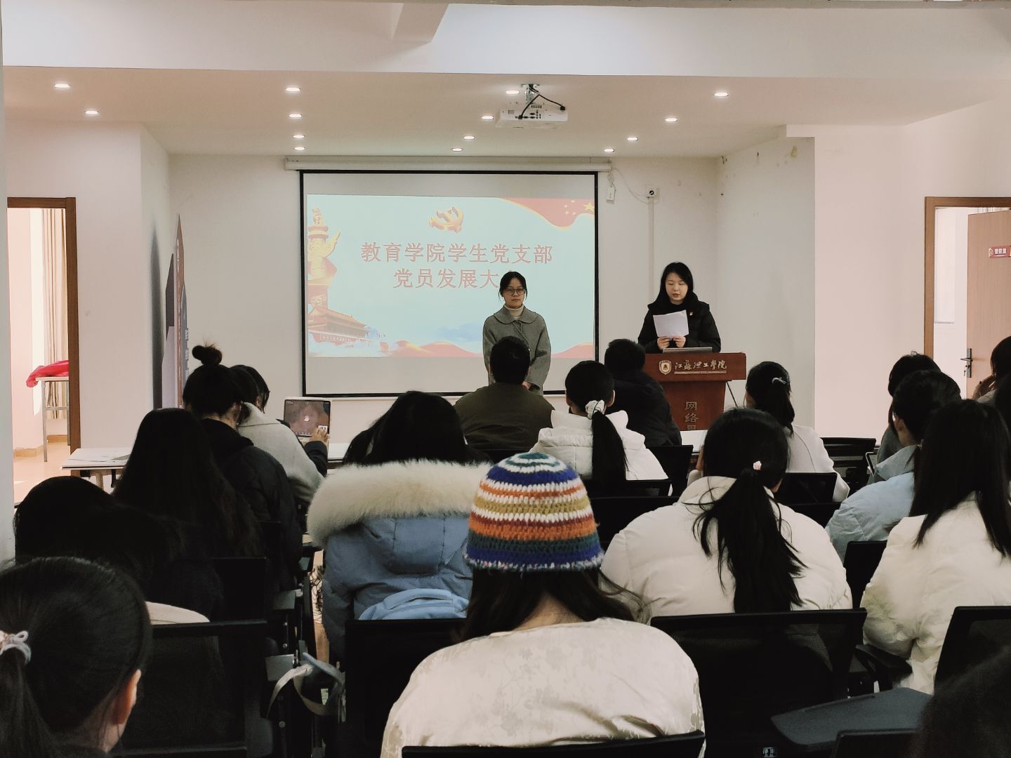 为加强党组织建设,严把党员发展质量关,同时给支部注入新鲜活力,教育学院学生党支部于2025年11月25日在38号楼网络思政社区隆重召开党员发展大会暨预备党员转正大会。教育学院学工办主任周一汛老师、学生党支部副书记蒋相杰老师、全体正式党员及预备党员出席会议,会议由教育学院党支部学生副书记倪欣蕊同志主持。