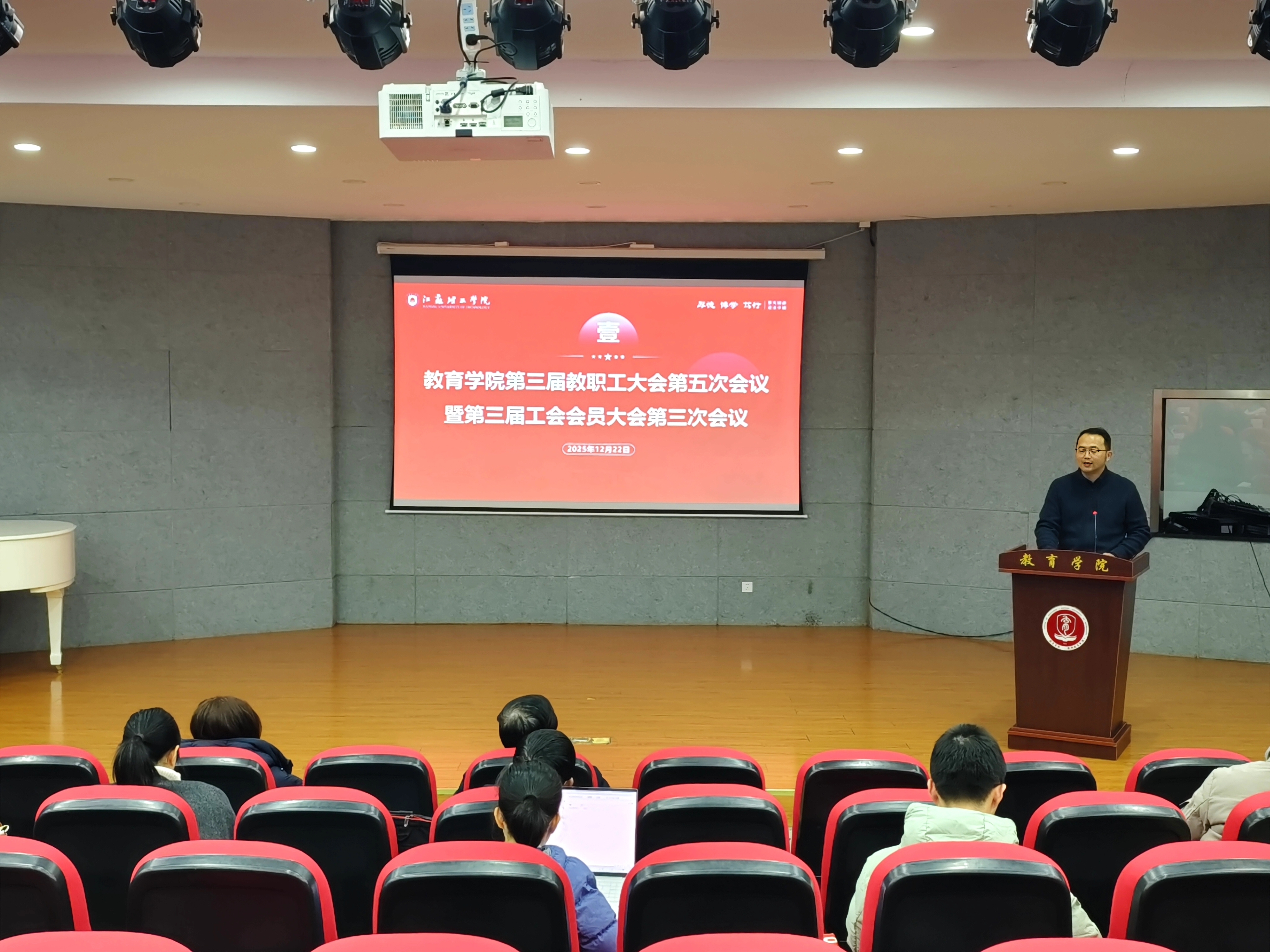 为进一步凝聚发展共识、汇聚奋进力量,扎实推进学院事业高质量发展,12月22日下午,我院在47号楼师范生音乐演播厅召开第三届教职工大会第五次会议暨第三届工会会员大会第三次会议。教育学院党政领导班子成员与全体教职工参加会议,会议由学院分工会文体委员、学工办主任周一汛主持。