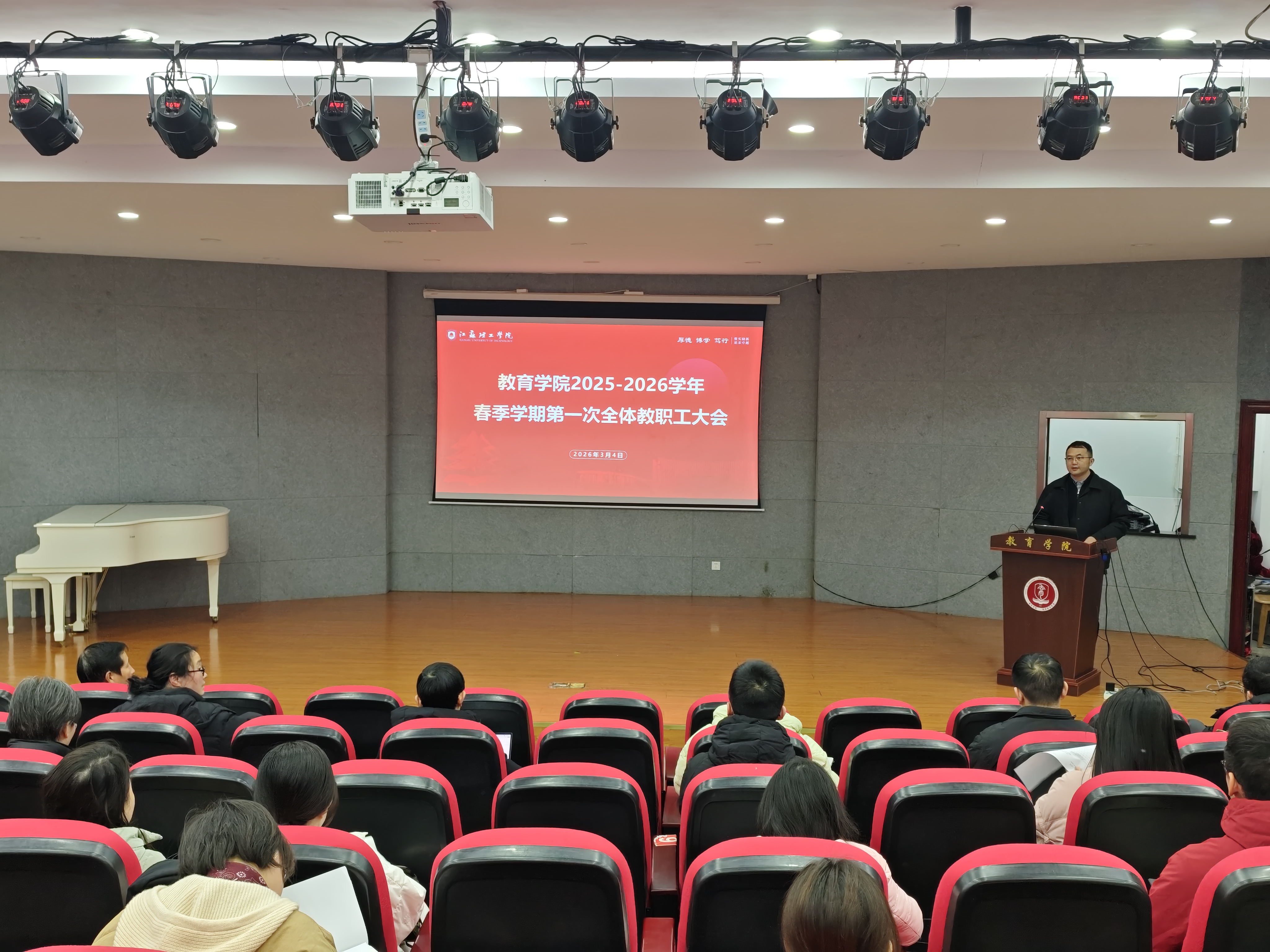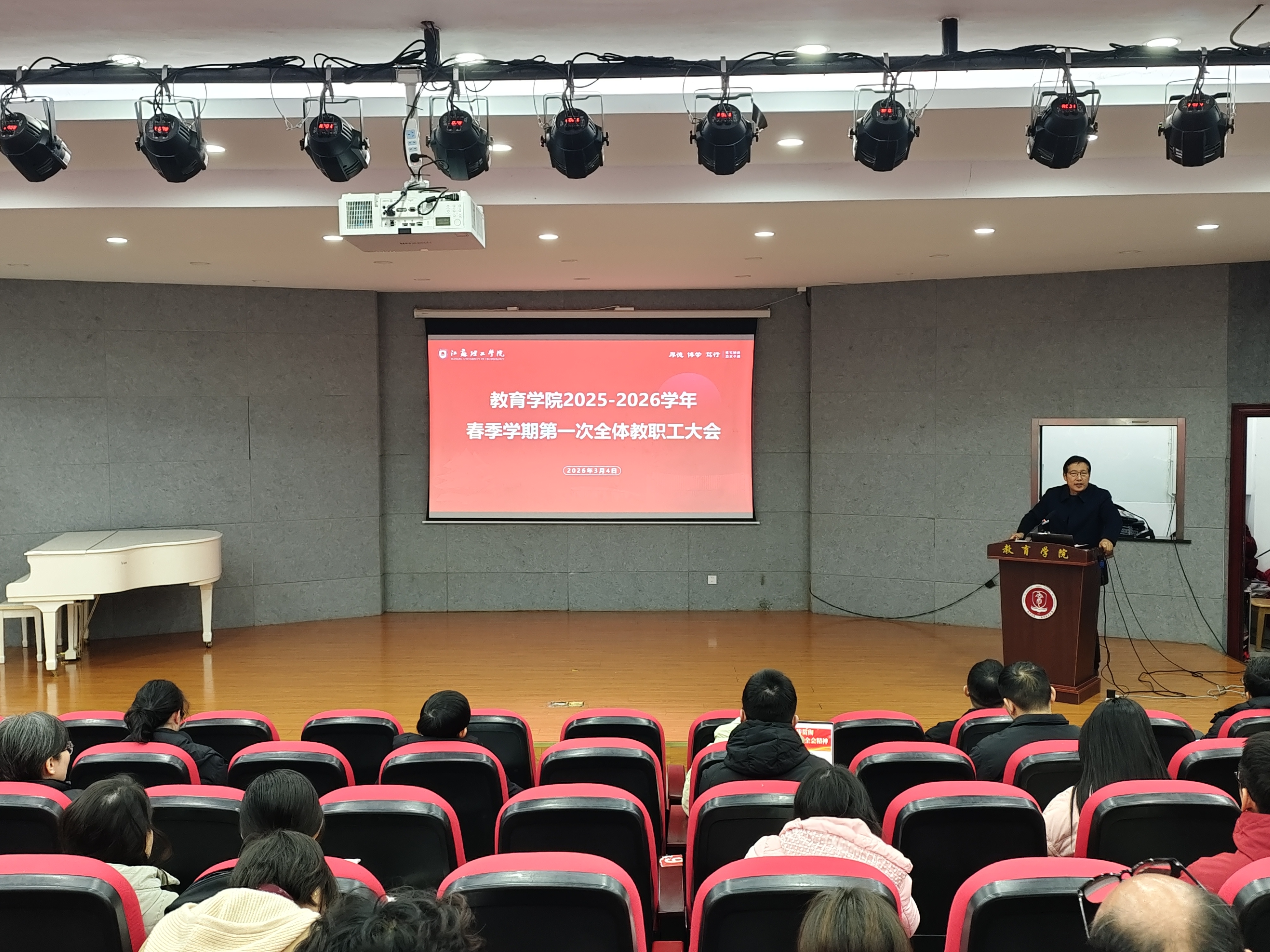 3月4日下午,我院在47号楼师范生音乐演播厅召开2025-2026学年春季学期第一次全体教职工大会,学院党政领导班子与全体教职工参加会议。会议由党委书记杨新春主持。
